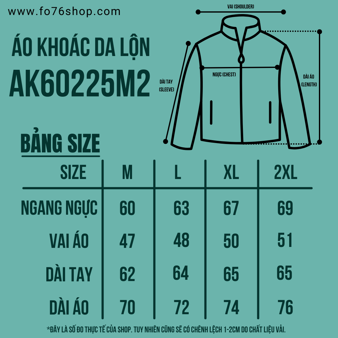 * Thông số cơ bản của sản phẩm FO76: Lấy chiếc áo mà các bạn đang mặc và cảm thấy vừa nhất sau đó đo các kích thước của áo và đối chiếu với bảng thông số của chúng tôi theo các kích thước sau: