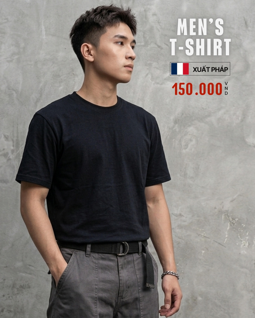 - ÁO THUN NAM CỔ TRÒN TAY NGẮN XUẤT PHÁP MÀU ĐEN AT60307L1