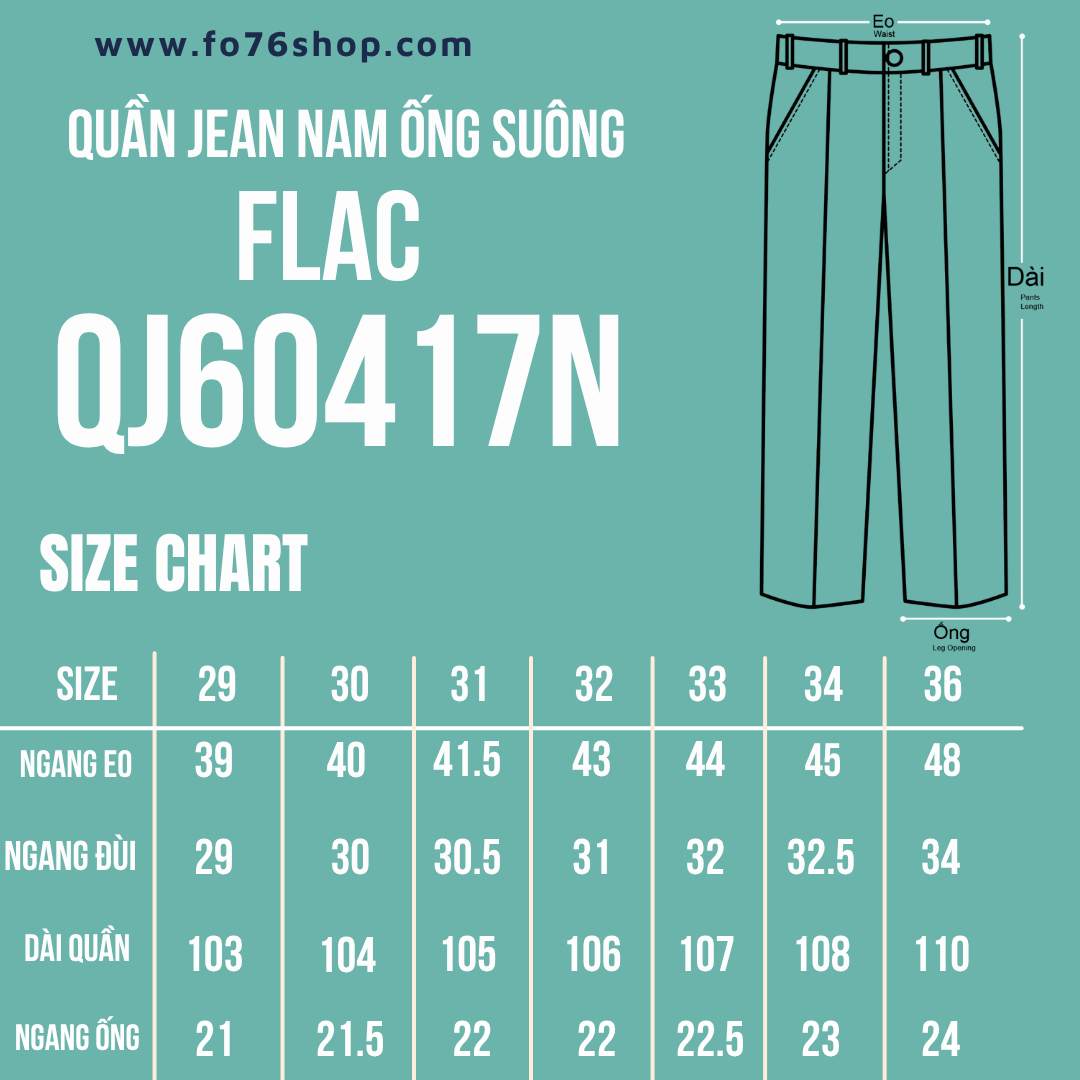 * Thông số cơ bản của sản phẩm FO76: Lấy chiếc quần mà các bạn đang mặc và cảm thấy vừa nhất sau đó đo các kích thước của quần và đối chiếu với bảng thông số của chúng tôi theo các kích thước sau: