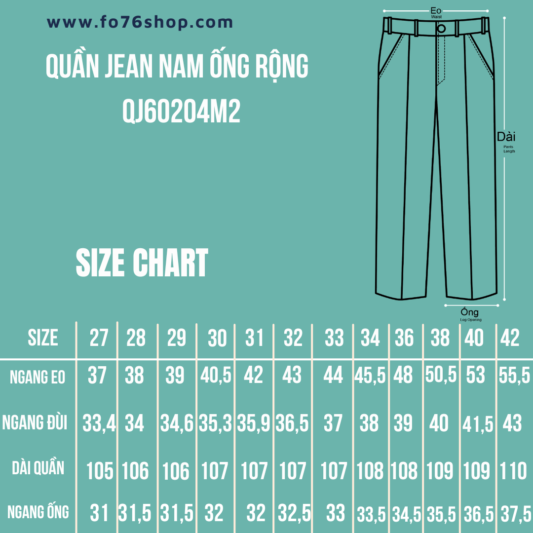 * Thông số cơ bản của sản phẩm FO76: Lấy chiếc quần mà các bạn đang mặc và cảm thấy vừa nhất sau đó đo các kích thước của quần và đối chiếu với bảng thông số của chúng tôi theo các kích thước sau: