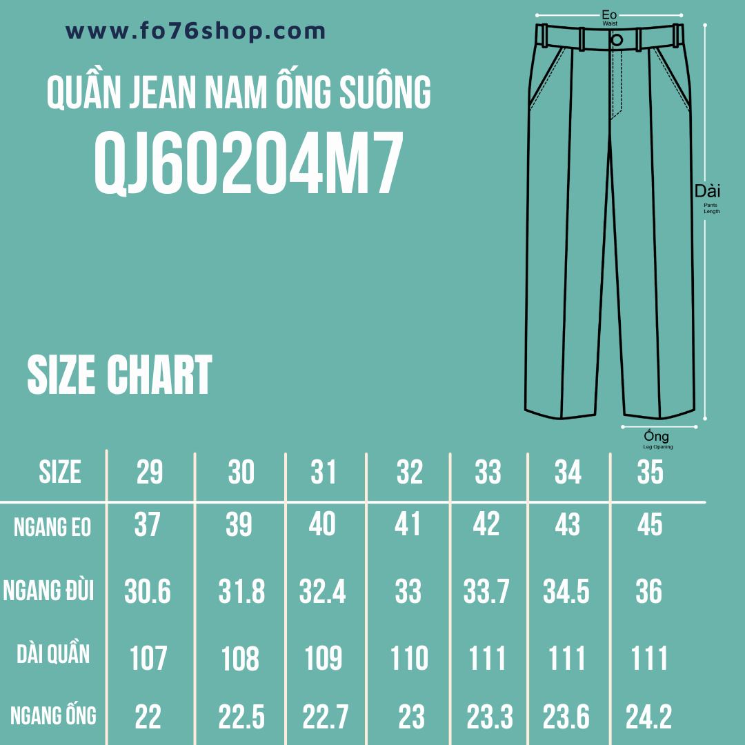 * Thông số cơ bản của sản phẩm FO76: Lấy chiếc quần mà các bạn đang mặc và cảm thấy vừa nhất sau đó đo các kích thước của quần và đối chiếu với bảng thông số của chúng tôi theo các kích thước sau: