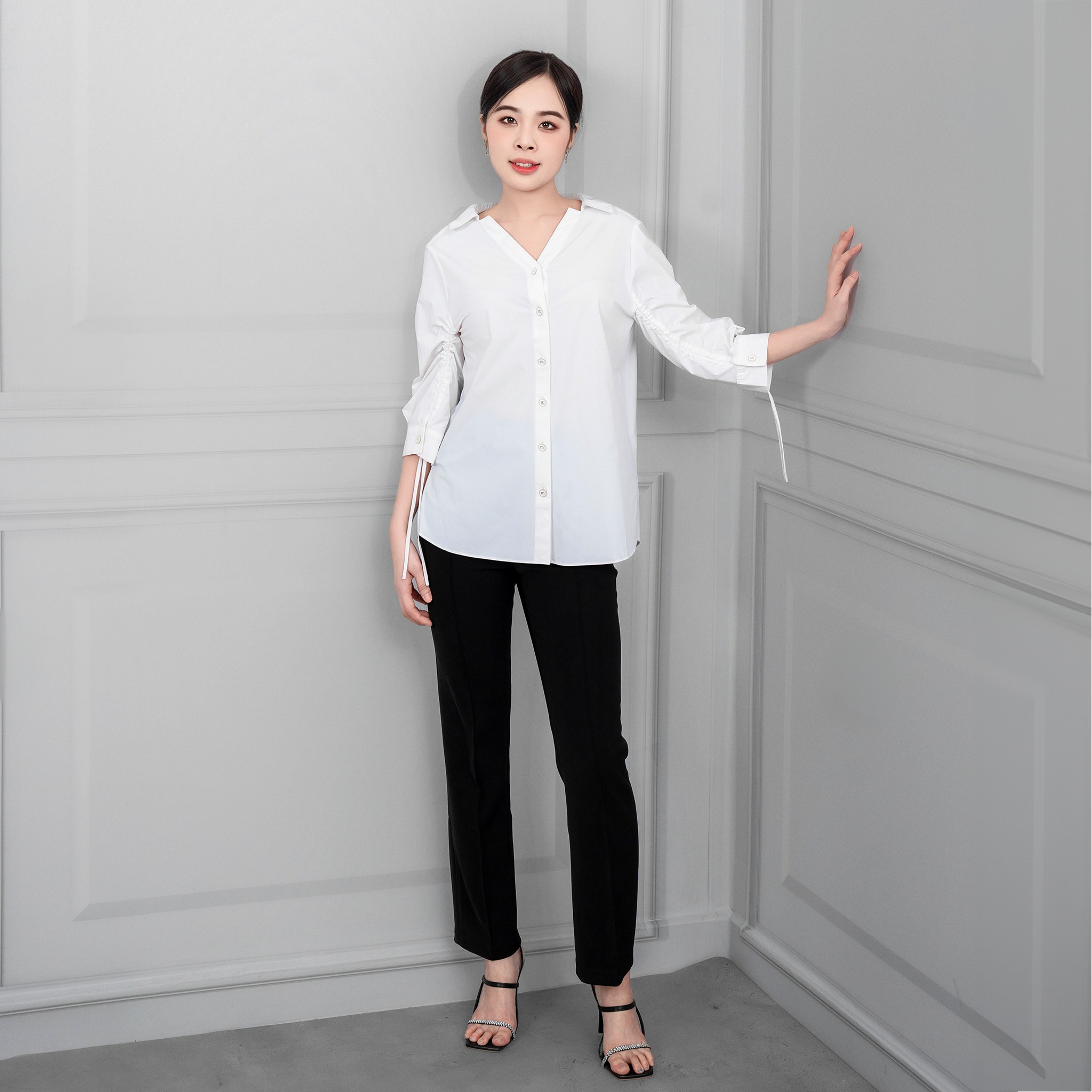 Áo sơ mi tay ngắn: Các kiểu áo sơ mi basic, tay hến, tay phồng sẽ là lựa chọn hàng đầu cho thời trang công sở vì nó không quá cầu kỳ và rất dễ mix-match với nhiều item khác.